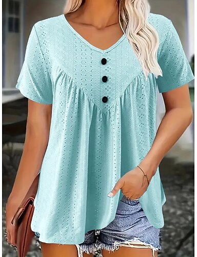 Mujer Camiseta Camiseta superior Ojal Color sólido Moda Clásico Casual Manga Corta Escote en Pico Tops regulares Diario Noche Fin de semana Negro Rojo Azul Real Oliva Verde Oscuro Verano Primavera