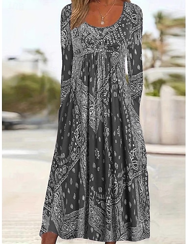 Mujer Vestido Midi Vestido Estampado Vintage Moda Moderno Diario Festivos Noche Ajuste regular Geométrico Manga Larga Cuello Barco Vino Marrón Gris Oscuro Gris Primavera Otoño Invierno