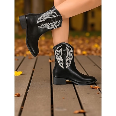 Botas vaqueras occidentales de media pantorrilla para mujer: piel sintética roja con bordado blanco, cremallera lateral y tacón bajo, ideales para festivales de música country, atuendos de rodeo y ropa urbana informal de otoño.