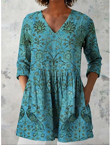 Mujer Blusa Estampado Floral Graphic Vacaciones Vintage Diario Manga 3/4 Escote en Pico Tops regulares Diario Festivos Noche Azul Piscina Vino Morado Verde Trébol Verano Primavera Otoño