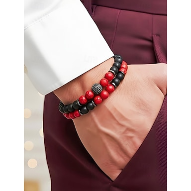 Juego de pulseras de cuentas para hombre: piedras de ojo de tigre rojo con detalles chapados en oro e incrustaciones de cristal negro para una apariencia elegante