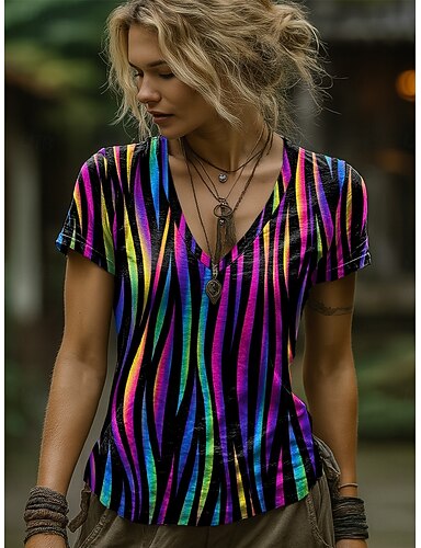 Mujer Camiseta Estampado Graphic Geométrico Abstracto Vintage Elegante Clásico Manga Corta Escote en Pico Tops regulares Diario Morado Verano Primavera