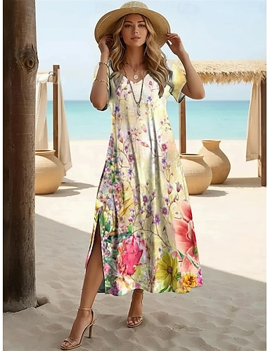 Mujer Vestido largo maxi Vestido informal Vestido de una línea Vestido Estampado Moda Moderno Exterior Vacaciones Fin de semana Ajuste regular Floral Graphic Manga Corta Escote en Pico Beige Verano