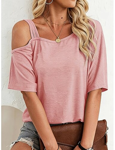 Mujer Camiseta Camiseta superior Ojal Plano Moda Elegante Clásico Manga Corta Cuello asimétrico Tops regulares Diario Noche Fin de semana Azul Piscina Negro Blanco Rosa Fucsia Verano Primavera