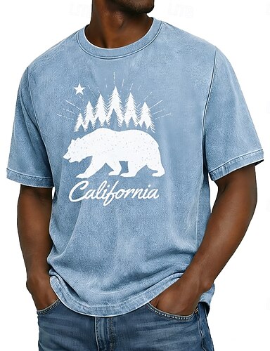 Camiseta para hombre con diseño de oso grizzly de California, pinos, bosque, estrella, estilo vintage, retro, para exteriores, naturaleza, lavado ácido, manga corta, corte estándar, ropa informal de