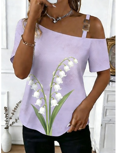 Mujer Camiseta Camiseta superior Estampado Floral Graphic Moda Clásico Casual Manga Corta Un Hombro Tops regulares Diario Noche Fin de semana Rosa Morado Verde Trébol Verano Primavera
