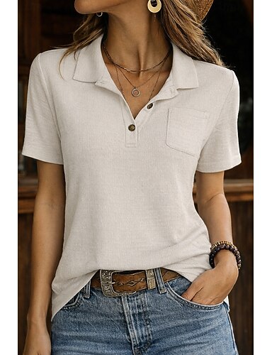Mujer Camisa Camisa de manga corta Camisa de verano Camisa casual Bolsillo Color sólido Plano Vacaciones Vintage Moda Manga Corta Cuello Vuelto Tops regulares Ropa de calle Playa Festivos Blanco