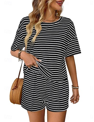 Mujer Conjuntos de dos piezas Conjuntos de pantalones cortos Manga Corta Cuello Barco A Rayas Moda Ropa de calle Casual Diario Exterior Negro Rosa Verde Trébol Verano Ajuste regular