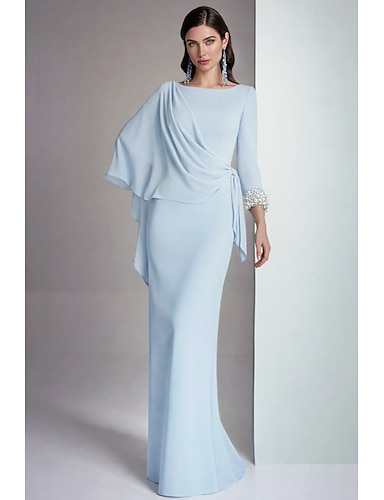 Funda Columna Hasta el Suelo Vestidos de noche Corte Cenicienta Elegante Madre de la novia Vestidos semi formales Manga Larga Escote Barco Boda Formal Gasa Espalda desnuda con Plisado Cuentas