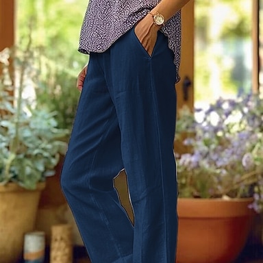 Mujer Lino de algodón sintético Pantalones Pantalones de verano Pantalones de playa Vacaciones Vintage Moda Longitud total Alta cintura Plano Bolsillo Cintura elástica Suave Cómodo Transpirable