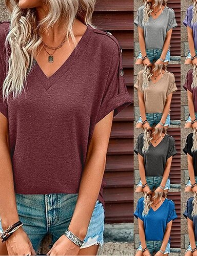 Mujer Camiseta Camiseta superior Botones Plano Moda Elegante Clásico Manga Corta Escote en Pico Tops regulares Diario Noche Fin de semana Azul Piscina Negro Vino Azul Marino Morado Verano Primavera