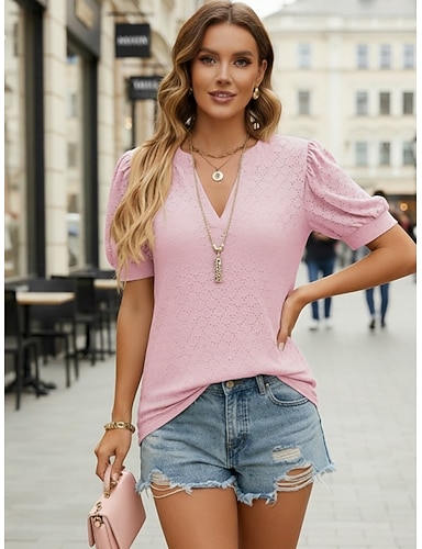 Mujer Blusa con textura Parte superior con ojales Camiseta de punto Blusa Frunce Plano Activo Moda Manga Corta Escote en Pico Tops regulares Casual Diario Exterior Negro Blanco Rosa Verde Oscuro Rosa