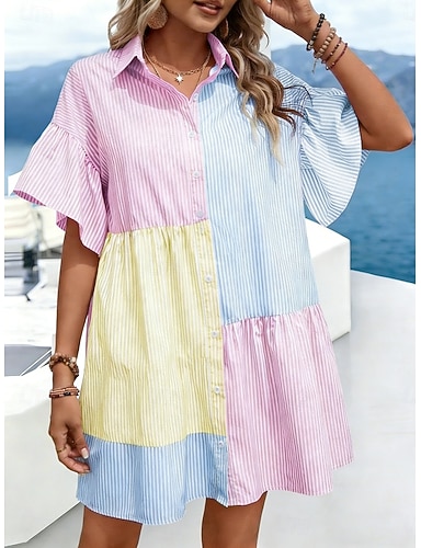 Mujer Mini vestido Vestido de Camisa Vestido informal Elegante Moda Moderno Exterior Vacaciones Noche Ajuste regular A Rayas Manga Corta Cuello Camisero Rosa Verano Primavera