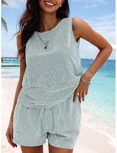 Mujer Conjuntos de pantalones cortos Sin Mangas Cuello Barco A Rayas Moda Ropa de calle Casual Diario Exterior Verde Trébol Verano Ajuste regular