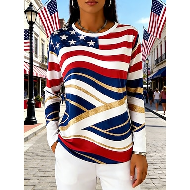 día de la independencia americana Mujer Camiseta Camiseta superior Estampado Graphic Bandera A Rayas Moda Básico Clásico Manga Larga Cuello Barco Tops regulares Diario Noche Fin de semana Rojo Verano