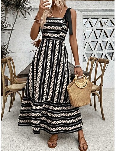 Mujer vestido largo vestido largo Vestido bohemio Vestido informal Vestido de verano Moda Exterior Vacaciones Fiesta Ajuste regular Geométrico Sin Mangas Sin Tirantes Negro Verano Primavera