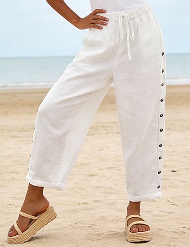 Mujer Pantalones de lino y algodón Pantalones Pantalones de verano Pantalones anchos Vacaciones Moda Casual / Diario Longitud total Alta cintura Color sólido Plano Correa Cintura elástica Perneras
