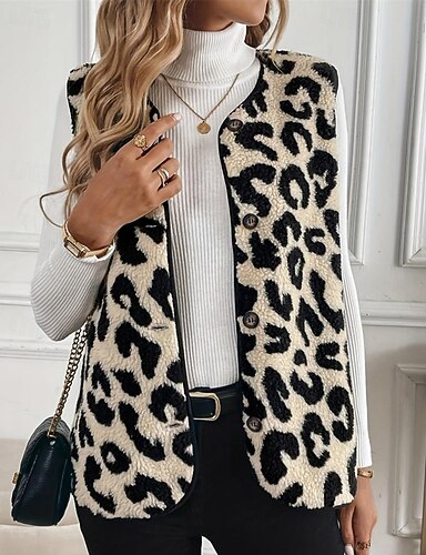 Mujer Chaleco polar Chaleco Mantiene abrigado Cómodo Botones Forrado con Lana Moda Moderno Casual Leopardo Noche Fin de semana Botonadura Simple Regular Escote en Pico Ajuste regular Sin Mangas Ropa