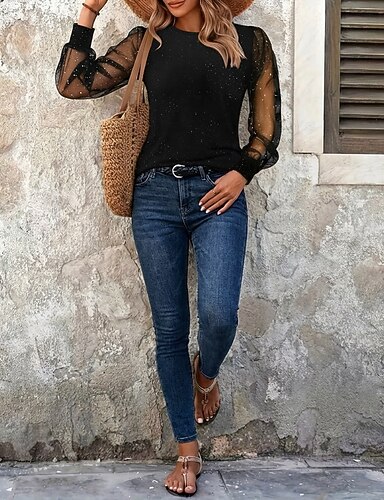 Mujer Lentejuela Brillante Fiesta Camiseta Retazos Malla Plano Moda Moderno Casual Manga Larga Cuello Barco Tops regulares Diario Fin de semana Azul Piscina Negro Vino Otoño Invierno