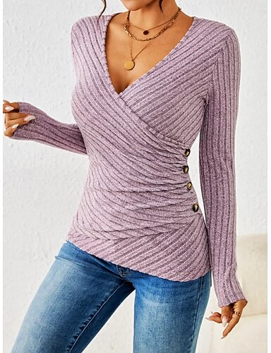 Mujer Blusa Color sólido Elegante Vintage Básico Manga Larga Escote en Pico Tops regulares Diario Azul Piscina Negro Verde Ejército Morado Primavera Otoño Invierno