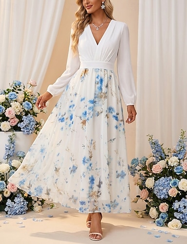 Mujer vestido largo vestido largo Vestido informal Vestido de raso Vestido de flores Elegante Moda Romántico Exterior Festivos Cita Ajuste regular Flor Manga Larga Escote en Pico Azul Piscina Blanco