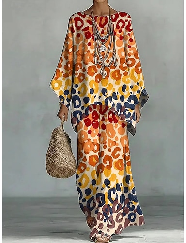 Mujer Camisa Conjuntos de lino y algodón Conjuntos de pantalones Manga Larga Campana Escote Redondo Graphic Leopardo Tie-dye Estampado Vacaciones Moda Ropa de calle Casual Diario Exterior Azul
