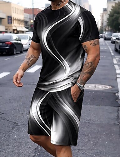 Hombre Geométrico Línea 2 piezas Conjuntos de camisetas Tops de verano Manga Corta Pantalones cortos Cuello Barco Deportes Casual De moda Diario Vacaciones Noche Impresión 3D Verano Azul Piscina