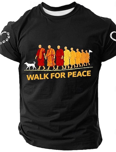Camiseta negra de manga corta con cuello redondo y texto de la Caminata por la Paz para hombres, con huella de pata de monje, silueta de perro Aloka, atención plena budista, ropa informal de verano en