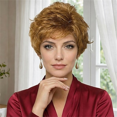Peluca corta y elegante de corte pixie color castaño rojizo para mujer: capas suaves y despeinadas.