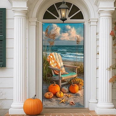 Banner de puerta de playa de otoño, calabaza costera otoñal, estrella de mar, colgante de pared, silla Adirondack, paisaje oceánico para puerta de entrada, porche, decoración del hogar