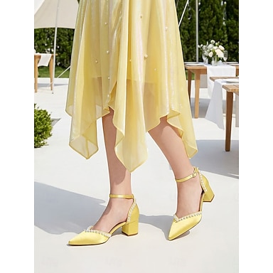 Zapatos Mary Jane de tacón cuadrado amarillo para mujer con ribete de perlas: elegantes zapatos para invitadas de boda en el jardín.