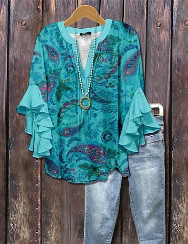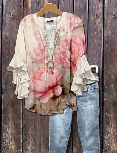 Mujer Camiseta Camiseta superior Volante Estampado Floral Graphic Moda Moderno Media Manga Escote en Pico Tops regulares Diario Noche Azul Piscina Azul Real Azul polvoriento Verano Primavera