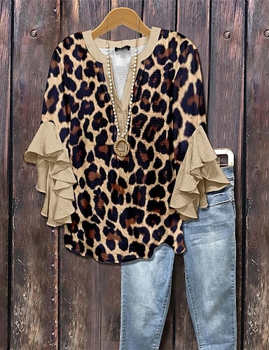 Mujer Camiseta Estampado Graphic Leopardo Vintage Moda Elegante Manga Larga Cuello Barco Escote Redondo Tops regulares Diario Fin de semana Rosa polvorienta Primavera Otoño Invierno