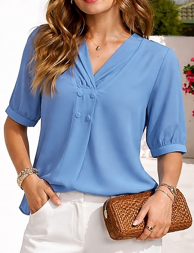 Mujer Camisa Camisa de verano Camisa casual Tops de gasa Volante Botones Color sólido Plano Elegante Vacaciones Moda Manga Corta Escote en Pico Tops regulares Diario Ropa de calle Festivos Azul