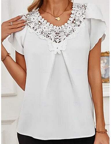 Mujer Blusa Encaje Retazos Estampado Floral Elegante Casual Manga Corta Escote en Pico Tops regulares Diario Azul Piscina Blanco Azul cielo Naranja Verano Primavera