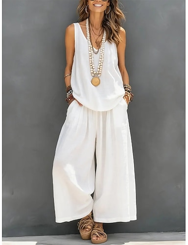 Mujer Conjuntos de lino y algodón Conjuntos de dos piezas Conjuntos de pantalones Sin Mangas Cuello Barco Plano Moda Ropa de calle Casual Diario Exterior Blanco Amarillo Caqui Verano Ajuste regular