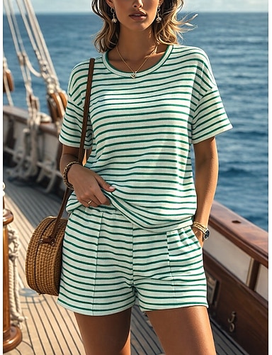Mujer Conjuntos de pantalones cortos Manga Corta Escote Redondo A Rayas Estampado Moda Ropa de calle Casual Diario Exterior Verde Trébol Verano Ajuste regular