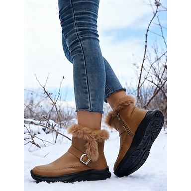 Botines marrones con ribete de piel sintética y hebilla para mujer: botines cortos de invierno cálidos con cremallera lateral para caminar y desplazarse a diario.