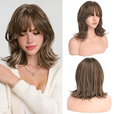 Peluca corta bob castaña con flequillo, hasta los hombros, ondulada, en capas, con puntas volteadas, aspecto natural, peluca de cabello sintético mediano para mujer, ideal para fiestas y uso diario,