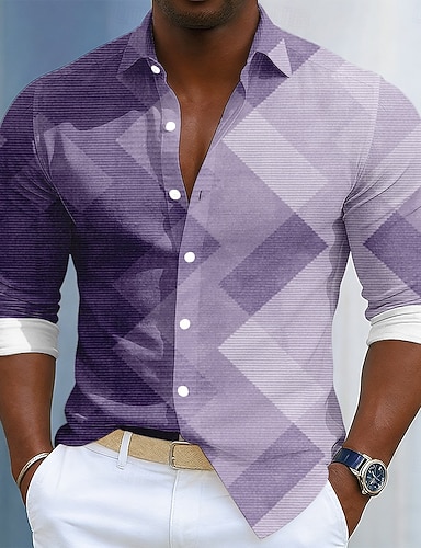 Hombre Plaid Camisa de raso Camisa para Vestido Abotonar la camisa Manga Larga Moda informal Vacaciones Ropa de fiesta de noche Uso Diario Verano Primavera Otoño Camisas con cuello Impresión 3D Dorado