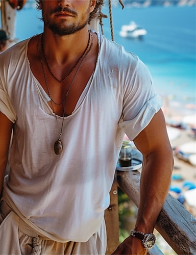 Hombre Camiseta superior Camiseta de lino Mangas cortas Escote en Pico Verano Plano Moda Design Básico Suave Vacaciones Casual Diario Playa Bleu Ciel Blanco Rosa Camiseta superior para hombre