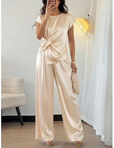Mujer Conjuntos de pantalones Manga Corta Cuello Barco Color sólido Moda Ropa de calle Trabajo Fiesta Formal Beige Verano Ajuste regular