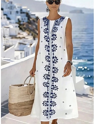Vestido midi de mujer azul y blanco con flores, vestido de vacaciones, vestido de corte A, vestido casual de vacaciones, estilo bohemio, playa, para salir, corte holgado, estampado geométrico, sin mangas, cuello redondo, blanco, verano, primavera