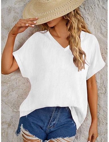 Mujer Camiseta Lino de algodón sintético Camiseta superior Plano Moda Elegante Clásico Manga Corta Escote en Pico Tops regulares Diario Noche Fin de semana Azul Piscina Negro Blanco Rosa Marrón