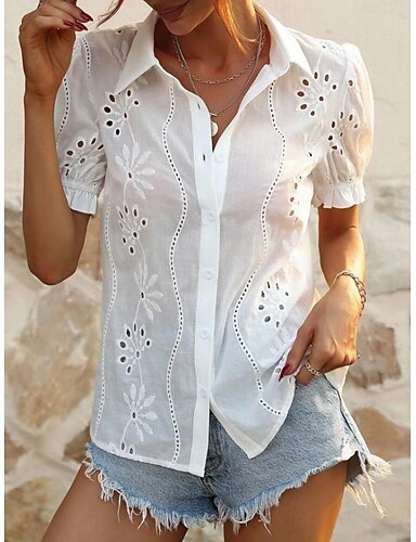 Mujer Camisa Blusa Ojal Botones Color sólido Elegante Casual Manga Corta Cuello Camisero Tops regulares Diario Blanco Verano Primavera