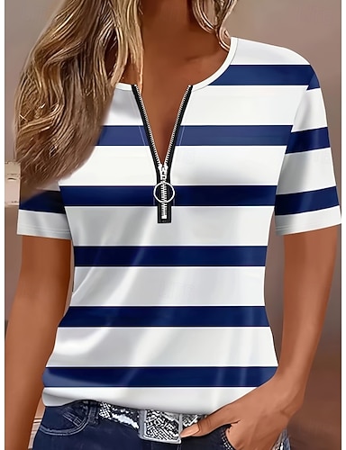 Mujer Camiseta Cremallera Cremallera de un cuarto Graphic Geométrico Bloque de color Tropical Hawaiano Elegante Manga Corta Cuello Barco Tops regulares boda en la playa Diario Deportes Azul Piscina