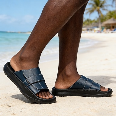 Sandalias planas azules para hombre, con puntera abierta, estilo casual, con tira ancha, cómodas, ideales para el verano, vacaciones en la playa, resorts y piscinas, viajes a la costa, actividades al aire libre y uso diario en climas cálidos.