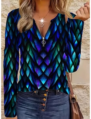 Mujer Camiseta Cremallera Estampado Graphic Geométrico Abstracto Vintage Moda Elegante Manga Larga Cuello Barco Tops regulares Diario Azul Piscina Verde Trébol Primavera Otoño