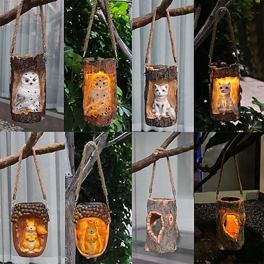 Faroles colgantes solares impermeables de resina con forma de animales, ideales para exteriores: búho, zorro, ardilla, hueco de árbol, Papá Noel. Luces LED decorativas para jardín, patio, césped,