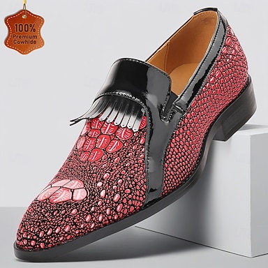 Mocasines de vestir de piel auténtica de primera calidad para hombre, en rojo y negro, con relieve de raya y flecos. Zapatos formales sin cordones para invitados a bodas, banquetes, fiestas, graduaciones y ocasiones especiales. Estilo elegante y sofistica